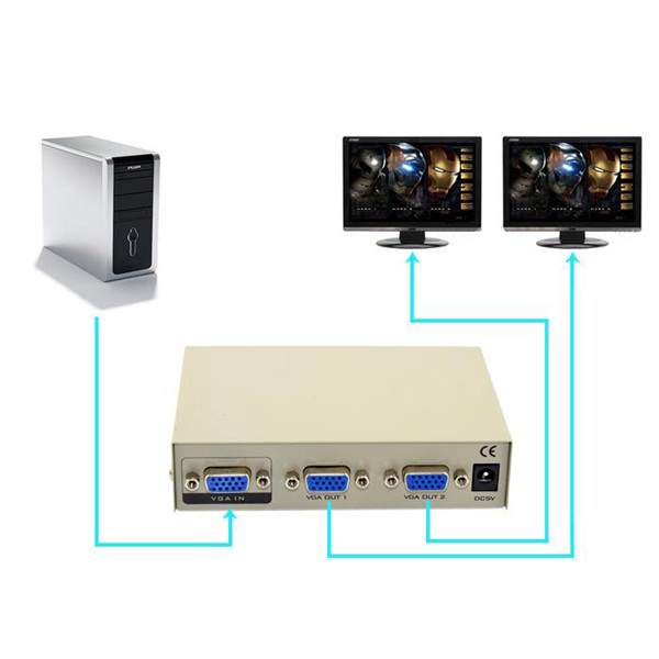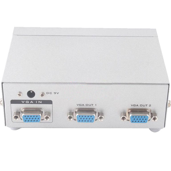 This video switch splitter features its excellent work performance and can bring much convenience to the users. It can let the signals from one computer splitted to two monitors, projectors, etc in high quality. With its help, two monitors, LCDs, Projectors or other devices, can share one PC. It's really a good thing for you to save money!